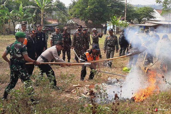 BREBES – Petugas gabungan di Kecamatan Banjarharjo Kabupaten Brebes melakukan pemadaman api simulasi penanggulangan Karhutla (Kebakaran Hutan dan Lahan) di Lapangan Limbangan Desa Malahayu.