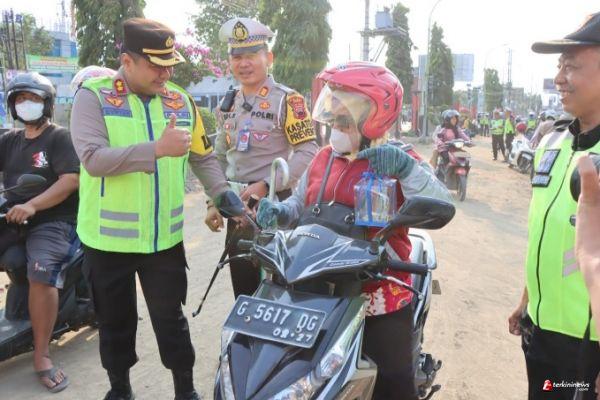 Didampingi Kasat Lantas Polres Brebes AKP Edi Sukamto dan UP3D Samsat Brebes serta dari Jasa Raharja, Kapolres Brebes AKBP Guntur Muhammad Tariq memberikan apresiasi dan reward berupa sovenir dan payung pada sejumlah pengendara yang tertib dan komplit kelengkapan peroranganya maupun surat surat kendaraan.