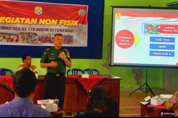 Kendal - Satuan Tugas TNI Manunggal Membangun Desa (TMMD) Reguler ke-118 Kodim 0715/Kendal memberikan penyuluhan dalam rangka menggelorakan dan meningkatkan wawasan kebangsaan dan kesadaran bela negara. Kegiatan non fisik ini menjadi bagian dari pelaksanaan TMMD yang memiliki sasaran warga Desa seputaran Desa Purwogondo kegiatan di laksanakan di Balai Desa Salamsari Kecamatan Boja,