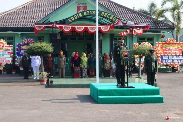 BREBES – Dandim 0713 Brebes Letkol Infanteri Tentrem Basuki pimpin upacara HUT TNI ke-78 di halaman makodim setempat. Kamis (5/10/2023).