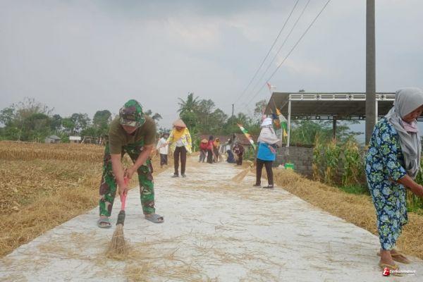 KENDAL - Pengerjaan sasaran fisik dalam TMMD ke 118 yang menyisakan waktu sepekan terus digenjot Satgas bersama warga desa Purwogondo Kecamatan Boja Kendal. Pengerjaan pengecoran jalan desa yang dulunya jalan batu, sekarang sudah terlihat setelah dilakukannya pengecoran jalan yang masih berlangsung hingaa hari ini., Jumat (13/10/23),