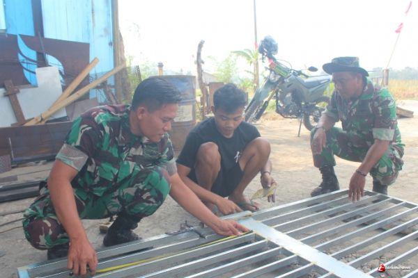 Meskipun dalam keadaan lelah melaksanakan program TMMD, Satgas membantu orang tua asuh. Material yang digunakan untuk.pagar ini berupa besi yang di rangakai dengan di las.