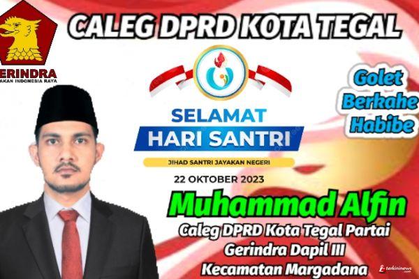TEGAL - Caleg DPRD Kota Tegal Dapil III (Margadana - Kota Tegal) Dari Partai Gerindra Muhammad Alfin Mengucapkan Selamat Hari Santri Nasional 22 Oktober 2023.