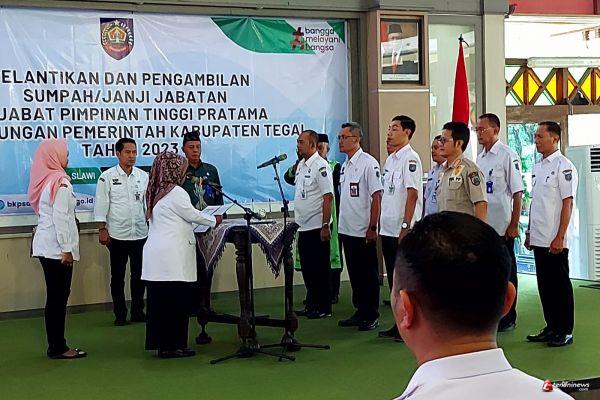 TEGAL - Bupati Tegal Umi Azizah melantik dan mengambil sumpah janji jabatan delapan Pejabat Tinggi Pratama hasil dari seleksi terbuka di Pendopo Amangkurat pada, Rabu (13/12/2023) siang.