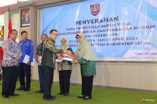Hal ini disampaikan Agustyaryah saat menyerahkan surat keputusan (SK) pemberhentian dan pemberian pensiun kepada 92 orang pegawai negeri sipil (PNS) Pemkab Tegal di Pendopo Amangkurat, Selasa (23/01/2024) pagi.