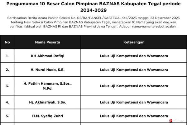 Berikut adalah daftar calon pimpinan Baznas Kabupaten Tegal Periode 2024-2029 yang dinyatakan lulus seleksi kompetensi dan wawancara.