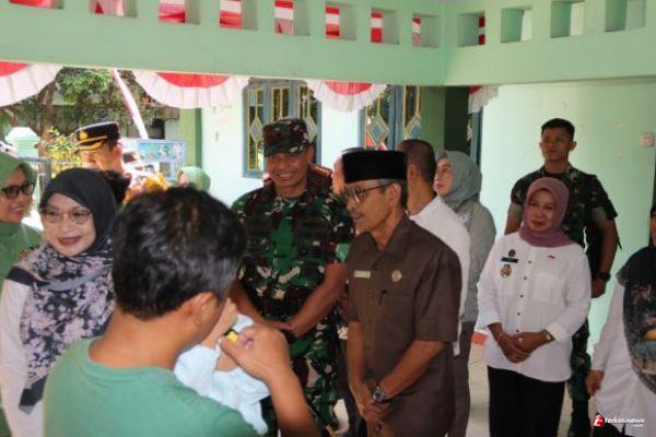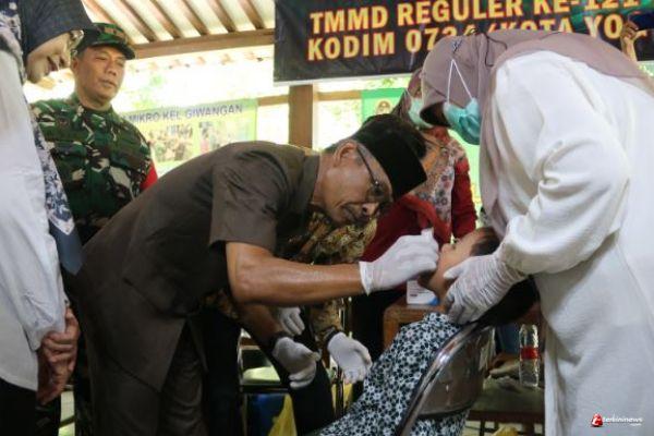 YOGYAKARTA - Asisten Sekretariat Daerah DIY Bidang Perekonomian dan Pembangunan Drs. Trisaktiana, M.Si, didampingi oleh oleh Danrem 072/Pamungkas, Brigadir Jenderal TNI Zainul Bahar, S.H., M.Si. dan Dandim 0734/Kota Yogyakarta, Letkol Inf Devy Kristiono, S.E., M.Si meninjau Penetesan PIN Polio yang diselenggarakan Pemerintah Kota Yogyakarta di Kelurahan Giwangan yang mejadi lokasi TMMD Reg ke-121 TA. 2024 Kodim 0734/Kota Yogyakarta, Rabu (24/07/2024).