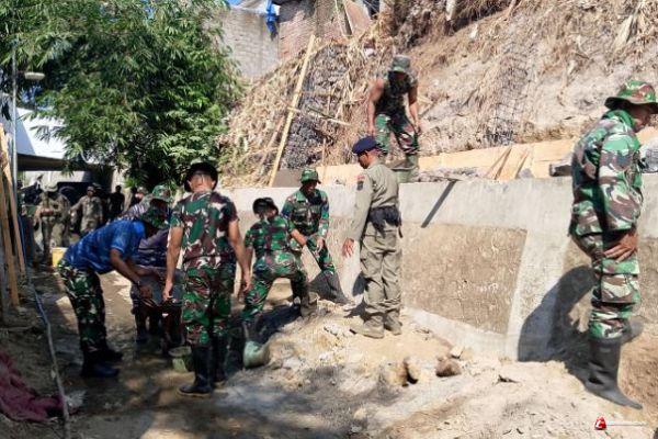 YOGYAKARTA - Anggota Satgas TMMD reg ke -121 membangun talut di Komplek Makam Kyai Wongso Sukarto yang berlokasi di Kampung Mrican, Kelurahan Giwangan, Kemantren Umbulharjo, Kamis (25/07/2024).