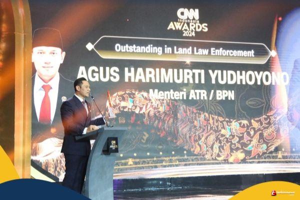 SURABAYA- Menteri Agraria dan Tata Ruang/Kepala Badan Pertanahan Nasional (ATR/BPN), Agus Harimurti Yudhoyono (AHY) menerima penghargaan atas sinergi dan kolaborasi yang dilakukan dalam pemberantasan mafia tanah bersama kepolisian, kejaksaan, dan pemerintah daerah. Penghargaan Outstanding in Land Law Enforcement ia terima dalam CNN Indonesia Awards 2024, Rabu (25/09/2024).