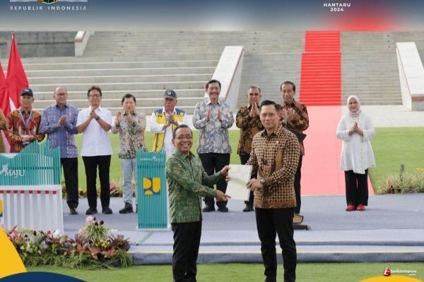 NUSANTARA - Menteri Agraria dan Tata Ruang/Kepala Badan Pertanahan Nasional (ATR/BPN), Agus Harimurti Yudhoyono (AHY) mendampingi Presiden Joko Widodo dalam Peresmian Istana Negara di Ibu Kota Nusantara (IKN), Provinsi Kalimantan Timur, Jumat (11/10/2024). Dalam kesempatan ini, Menteri AHY menyerahkan Sertipikat Tanah Elektronik berupa Hak Pakai untuk Istana Negara dan Istana Garuda kepada Menteri Sekretaris Negara, Pratikno di hadapan Presiden Joko Widodo.