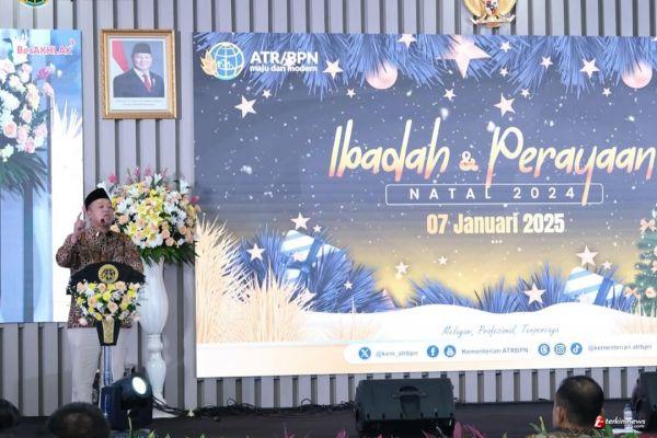 JAKARTA - Kementerian Agraria dan Tata Ruang/Badan Pertanahan Nasional (ATR/BPN) menggelar Ibadah dan Perayaan Natal Tahun 2024 secara daring dan luring di Aula Prona, Jakarta, pada Selasa (07/01/2025). Menteri ATR/Kepala BPN, Nusron Wahid mengatakan, kegiatan ini bukan hanya sekadar perayaan semata namun menjadi wujud komitmen bersama bahwa tidak adanya diskriminasi di lingkungan Kementerian ATR/BPN serta membangun perdamaian antar umat beragama.