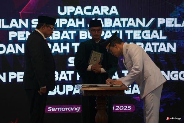SEMARANG – Penjabat (Pj) Gubernur Jawa Tengah Nana Sudjana resmi melantik Amir Makhmud sebagai Pj Bupati Tegal. Pengambilan Sumpah Jabatan dan Pelantikan Pj Bupati Tegal sekaligus Serah Terima Jabatan dari Pj Bupati Tegal sebelumnya berlangsung di Gedung Gradhika Bhakti Praja, Kantor Gubernur Jawa Tengah, Kota Semarang, Selasa (21/01/2025).