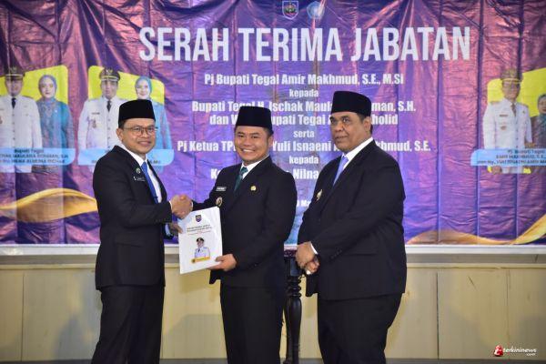 Proses serah terima jabatan diawali, Pj Bupati Tegal Amir Makhmud menyerahkan kepada Bupati Tegal Ischak Maulana Rohman dan Wakil Bupati Tegal Ahmad Kholid. Kemudian dilanjutkan serah terima jabatan Pj Ketua TP PKK Yuli Isnaeni Amir Makhmud kepada Ketua TPPKK Nilna Almuna Ischak.
