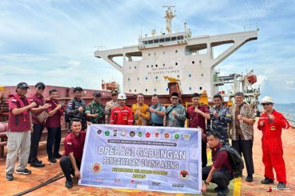BATAM — Dalam rangka memperkuat pengawasan terhadap keberadaan dan aktivitas Warga Negara Asing (WNA) di wilayah perairan Indonesia, Tim Pengawasan Orang Asing (TIMPORA) Kantor Imigrasi Kelas II TPI Belakang Padang melaksanakan Operasi Gabungan dengan menyasar kapal asing MV. MANASOTA yang sedang berlabuh di sekitar Pulau Nipah, Kecamatan Belakang Padang, Kamis (24/4/2025).