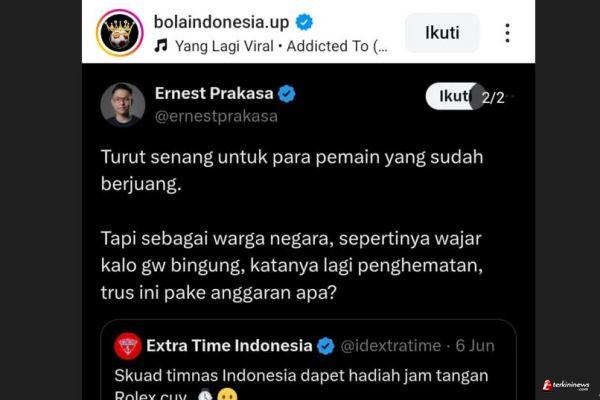 JAKARTA - TERKININEWS.COM - Komika sekaligus pemerhati kebijakan publik, Ernest Prakasa, angkat suara mengenai tindakan Presiden Prabowo Subianto yang memberikan hadiah berupa jam tangan mewah kepada para pemain Timnas Indonesia. Dalam cuitannya di platform X (dulu Twitter), Ernest menyampaikan apresiasinya atas perjuangan Timnas, namun mempertanyakan asal-usul anggaran yang digunakan untuk pembelian hadiah tersebut.