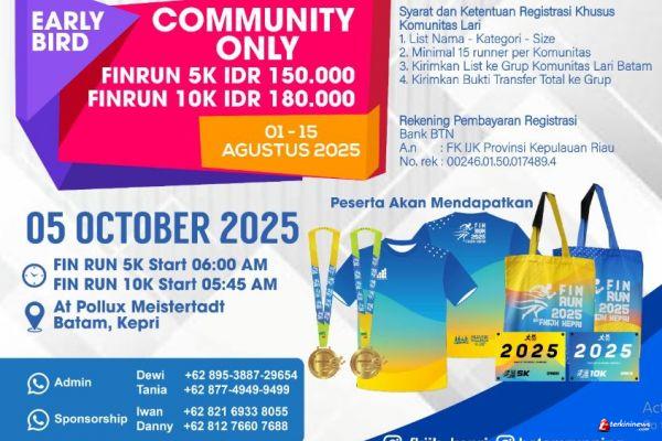 BATAM – TERKININEWS.COM - Batam Siap Bergegas! FIN RUN 2025 Hadir Khusus untuk Komunitas LariDunia olahraga Kota Batam akan kembali semarak dengan hadirnya FIN RUN 2025 yang diselenggarakan oleh Forum Komunikasi Industri Jasa Keuangan (FKIJK) Kepri. Acara lari tahunan ini akan digelar pada 5 Oktober 2025 bertempat di kawasan ikonik Pollux Meisterstadt, Batam.