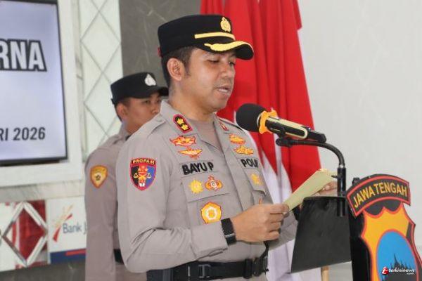 TEGAL - TERKININEWS.COM - Kepala Kepolisian Resor Tegal, AKBP Bayu Prasatyo, S.H., S.I.K., M.H., memimpin upacara Serah Terima Jabatan (Sertijab) untuk Kapolsek Warureja dan Kasatbinmas Polres Tegal, serta penyerahan jabatan Kapolsek Adiwerna. Kegiatan berlangsung di Aula Tantya Sudhirajati Mapolres Tegal pada Kamis (29/1/2026).