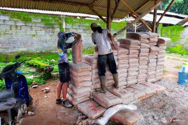 ‘Di sepanjang jalan yang di cor terdapat beberapa pondok kayu yang memang biasa di pakai warga untuk mengamankan hasil panen sementara , itu kami gunakan untuk menyimpan material”, terangnya