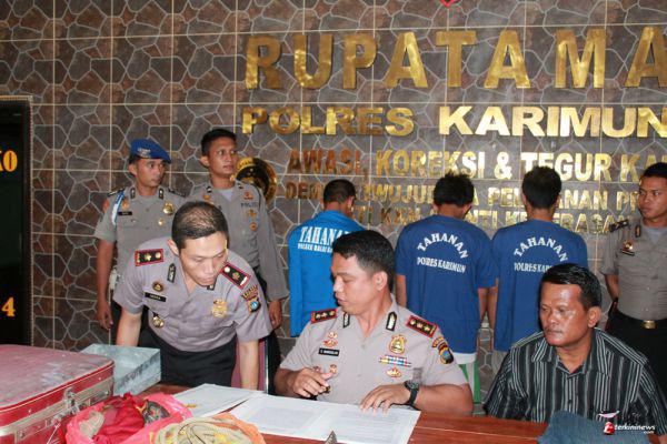 Kapolres Karimun, AKBP Suwondo Nainggolan menggelar jumpa pers di depan ruang rapat utama (Rupatama) Mapolres Karimun, Selasa (28/10) kemarin. peristiwa yang terjadi pada Senin, (29/10/2014) sekitar pukul 22.00 WIB dengan korban meninggal dunia, Thian Pheng (49) sebagai pemilik toko sembako, dan Khong Ik Ling (74) merupakan ibu korban yang saat ini mengalami kondisi luka berat, kemudian Rudiyanto (32) adik korban yang kini juga mengalami kondisi luka berat.
