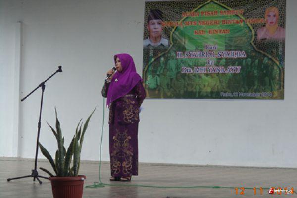 BINTAN - Rabu pagi (11/12/2014), diselenggarakan acara Pisah Sambut Kepala Sekolah yang lama, H.Syahrial Syah BA, kepada Kepala Sekolah yang baru, Dra Meiyana Ayu. Acara dilaksanakan di Akau Taman Kota Kijang dan dihadiri oleh guru beserta karyawan maupun murid - murid MTSN Nurul Iman Kijang dari jam 09.00 hingga 11.00.