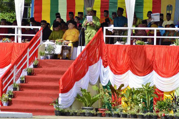 LINGGA - Bupati Lingga, H Daria memimpin upacara peringatan Hari Jadi Kabupaten Lingga ke-11 di lapangan sepak bola Sultan Mahmud Riayat Syah, Senin (24/11/2014).