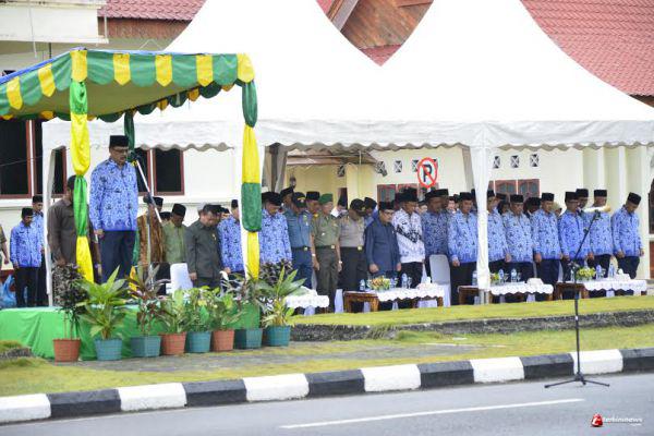LINGGA - Bupati Kabupaten Lingga H Daria, pimpin Upacara peringatan HUT PGRI yang ke-69 disejalankan dengan hari jadi KORPRI ke-43, di Halaman Kantor Bupati Lingga, Senin (1/12).