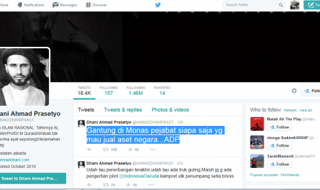 Tidak terima dengan kenyataan itu, Dhani yang di Pilpres 2014, berada di kubu Prabowo Subianto, menumpahkan uneg-unegnya di Twitter, @AHMADDHANIPRAST. "Gantung di Monas pejabat siapa saja yg mau jual aset negara...ADP," katanya dengan tanda 'ADP' yang berarti kicauan tersebut ditulis Dhani sendiri.
