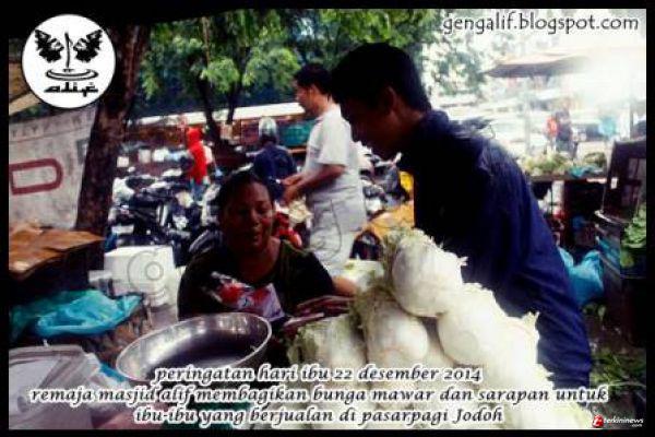 Kegiatan ini dilaksanakan untuk memperingati hari ibu yang jatuh pada tanggal 22 desember setiap tahunnya. Dan pada peringatan kali ini remaja masjid alif atau yang sering disebut geng alif mengadakan kegiatan pembagian bunga mawar dan sarapan pagi untuk ibu-ibu yang berjualan dipasar pagi, jodoh.