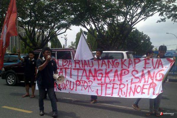 Pendemo yang menamakan diri Himpunan Mahasiswa Ocu Kampar (HMOK-Pku), Kamis (22/1/15), menggelar aksi demonstrasi di depan pintu gerbang Kepolisian Daerah (Polda) Riau. Mereka mempertanyakan kasus dugaan penganiayaan yang dilakukan istri Bupati Kampar Eva Yuliana dan 2 ajudannya.