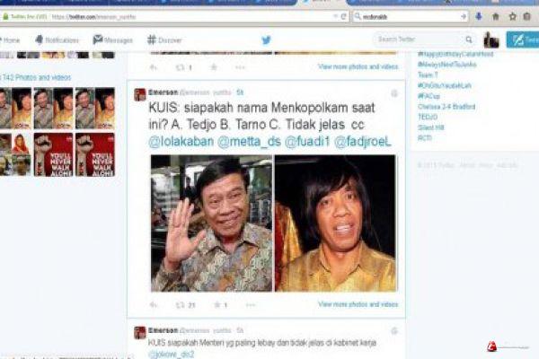 Aktivis antikorupsi, Emerson Yuntho melalui akun twitternya, @emerson_yuntho, menuliskan lelucon tersebut. "KUIS: siapakah nama Menkopolkam saat ini? A. Tedjo B. Tarno C. Tidak jelas," ucap dia.