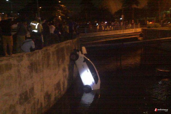 Dua orang petugas keamanan PT Bakti Alter Purba menjadi korban taksi Express yang tercebur di sungai di dekat Epicentrum, Kuningan, Jakarta Selatan.