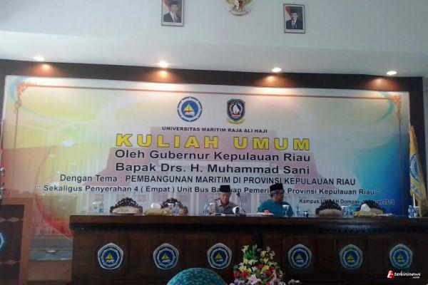 TANJUNGPINANG - Gubernur Kepulauan Riau , Muhammad Sani dijadwalkan akan mengisi kuliah umum di Auditorium Universitas Maritim Raja Ali Haji , Dompak pada pagi ini , jumat (13/03/2015) jam 09.00 wib . Adapun tema yang diangkat dalam kuliah umum ini adalah pembangunan maritim di Provinsi Kepulauan Riau.
