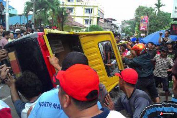 Akhirnya, demonstran meluapkan kekesalannya dengan menggoyang-goyangkan pick up dan akhirnya tumbang dan dinaiki oleh pendemo.