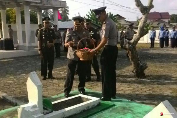 KARIMUN - Kapolsek Kundur Kompol Basta Nababan pagi Selasa (29/06) memimpin pelaksanaan ziarah dan tabur bunga di Taman Makam Pahlawan Pusara Bakhti Tanjungbatu Kundur dalam rangka memperingati HUT Bhayangkara ke-69.
