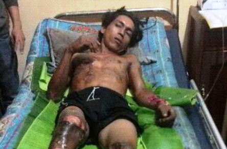TEMBILAHAN-Abdul Sasi (33), warga Kelurahan Sungai Empat, Kecamatan Gaung Anak Serka (GAS) mengalami luka bakar cukup parah, karena berusaha menyelamatkan anaknya dari kobaran api yang menghanguskan rumahnya, Jum'at (10/7/15).