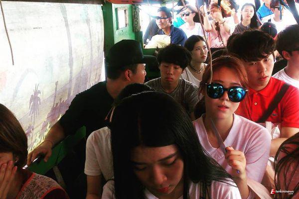TANJUNGPINANG - Pemandangan tak biasa terlihat di dalam sebuah perahu pompong menuju Pulau Penyengat hari ini (18/7/2015) perahu pompong tersebut dipenuhi turis-turis muda asal Korea Selatan.