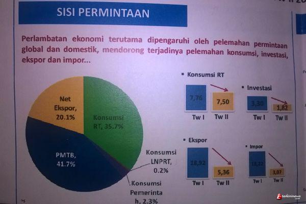 " perlambatan disisi permintaan ini mempengaruhi pelemahan tiga sektor lain, konsumsi rumah tangga menurun dari 7,76% kali ini menurun menjadi 7,50%, investasi goyang dari 3,30 menjadi 1,82%. Sedangkan ekspor dari 18,92% turun menjadi 5,36% " jelas gusti saat menggelar konferensi pers. Senin, (24/08/15).