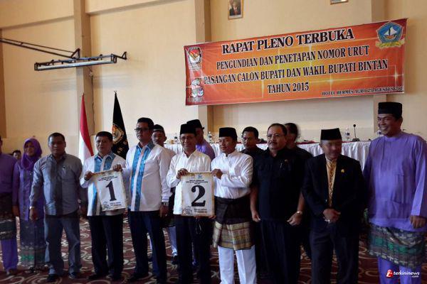 Nomor urut Calon Bupati (Cabup) dan calon Wakil Bupati (Cawabup) Kabupaten Bintan periode 2015-2020, telah diundi di hotel Hermes Bintan, Selasa (25/8/2015) siang. Pasangan Apri Sujadi dan Dalmasri Syam (ASRI) mendapat nomor urut 1 serta Pasangan Khazalik dan Indra Setiawan (KHAWAN) mendapat nomor urut 2.