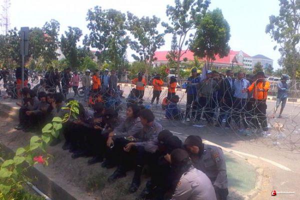 Teriknya Matahari, Buruh dan Aparat Kepolisian Berteduh
