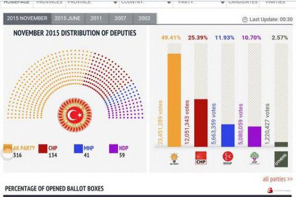 AK Party yang dipimpin Perdana Menteri Turki Ahmet Davutoglu memenangkan pemilu parlemen yang digelar hari Minggu, 1 November 2015. Dalam perhitungan hasil suara yang dilansir media Turki Daily Sabah dengan 99,53% suara yang telah dihitung, AKP meraih 49,41% suara atau 316 kursi parlemen (57,45% dari 550 kursi).