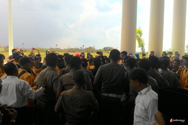‘’Tak jua ditemui perwakilan dari Pemprov, mahasiswa berupaya menerobos masuk. Namun upaya itu berhasil diredam Satpol PP yang ada di baris depan. Sementara polisi berada di dekat pintu masuk. Amarah mahasiswa menjadi. Mereka kembali menerobos masuk. Di luar gedung, mahasiswa semakin menjadi-jadi. Aksi saling dorong mahasiswa-Satpol PP tak terelakkan. Bahkan seorang mahasiswi sempat tersenggol saat petugas ingin menenangkan.’’ungkap Hairun selaku Orator demo tersebut.