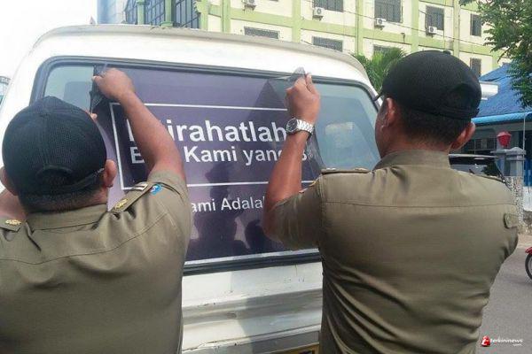 tim dari saatpol PP bergerak menyisir pelabuhan sri bintan pura, Tanjungpinang (20/11/2015) yang dijadikan tempat mangkl kendaraatn umum jenis angkot. kendaraan yang biasanya pada setiap pemilu selalu tertempel atribut kampanya pada kaca belakang ini sesuai perkiraan masih menjadi media kampanye para kandidat.