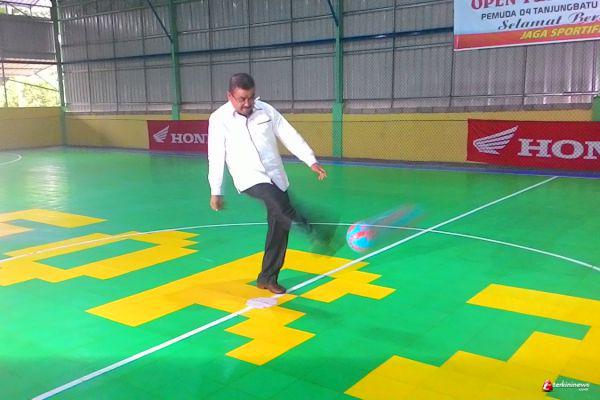 KARIMUN - Bupati Karimun H. Aunur Rafiq menendang bola ke gawang, di Lapangan Futsal Forza KM 4 Kelurahan Tanjungbatu Barat, Kecamatan Kundur. Tendangan itu menanadai dimulainya turnamen Futsal Pemuda 04 Cup II 2015, Jumat (20/11).