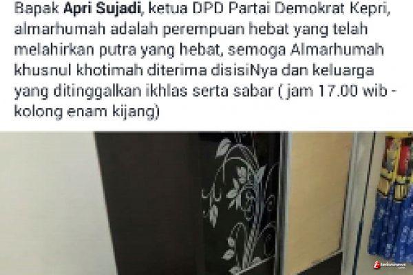 Kabar duka tersebut dikabarkan oleh Ketua Demokrat Tanjungpinang Husnizar Hood di alun facebooknya.