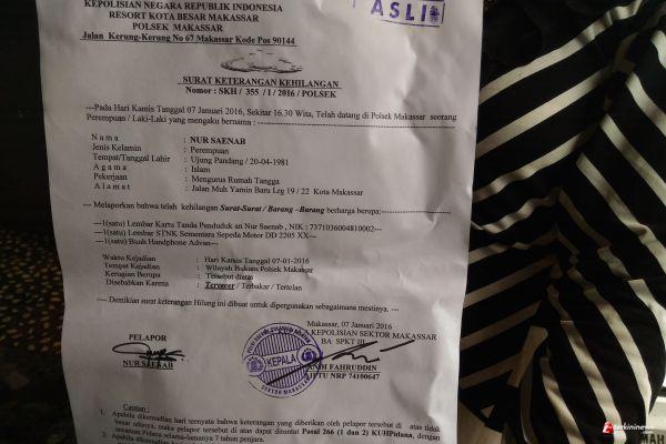 Korban Nur Senab telah melaporkan ke pihak Polsek Makassar dengan nomor pelaporan SKH/355/1/2016/polsek di Polsek Makassar pada kamis (07/01/2016).
