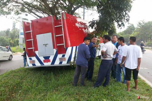 BATAM - Diduga akibat rem blong, sebuah mobil pemadam kebakaran (Damkar) tidak terkendali oleh sang sopir dan menghantam pohon yang ada di jalur hijau (12/1/2015).