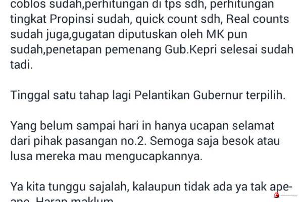 TANJUNGPINANG - Tim sukses pasangan calon Pilkada Kepri Sani - Nurdin (Sanur) Andi Anhar Chalid melalui alun facebooknya meminta kepada pasangan Soeryo - Ansar untuk mengucapkan secara langsung ucapan selamat kepada pasangan pemenang Pilkada Kepri tersebut.