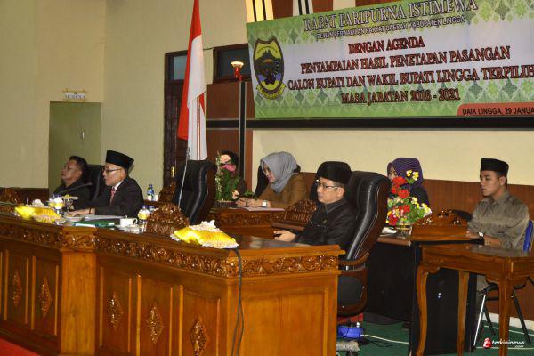 Pengesahan pasangan yang dikenal dengan sebutan "Lingga Terbilang" itu dilakukan dalam sidang paripurna istimewa yang dipimpin Ketua DPRD sementara Kamaruddin Ali, Jum'at (29/01).