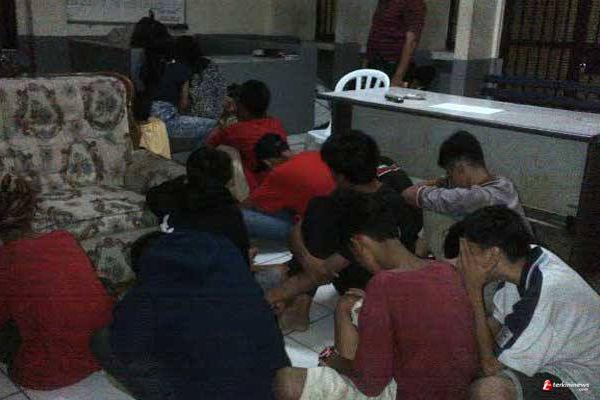 DEPOK - Reskrim Polsek Cimanggis mengamankan puluhan anak remaja diantaranya perempuan dan seorang pria pecatan tentara kedapatan membawa senjata tajam. Mereka diamankan pasca bentrok usai acara menonton musik regge hingga memakan korban di Mall Cimanggis, Jalan Raya Bogor, Mekarsari, Cimanggis, Kota Depok, Minggu (14/2) dini hari.