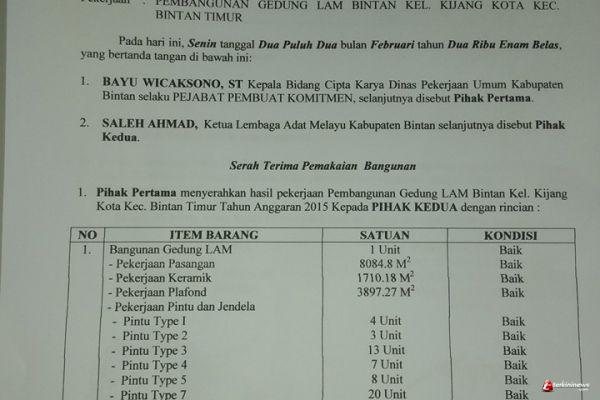 "Alhamdulillah Berita Acara Pemakaian Gedung Lembaga Adat Melayu Bintan telah ditandatangani dan diserah terimakan Pemakaian Gedung tersebut dari Dinas PU Bintan kepada LAM Bintan, Terima Kasih pada semua pihak yang telah bertungkus lumus bertungkai kepai" kata Saleh selaku ketua LAM Bintan, Selasa (23/02/2016).